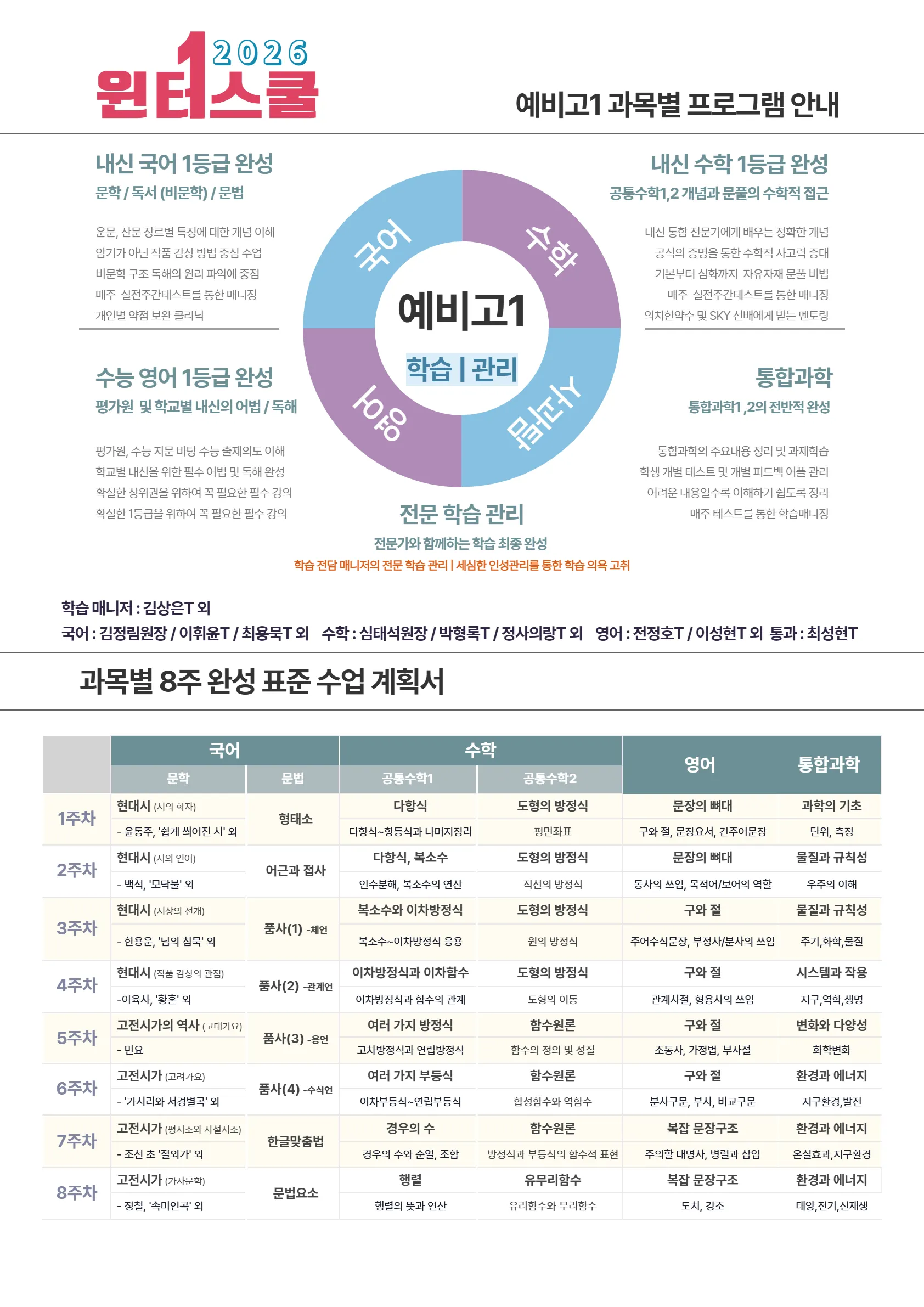 입시의 핵심인 국어와 수학을 중심으로 영어, 과학 등 필수과목을 아우르고 있습니다. 과목 선생님들의 유기적인 소통과 입체적인 관리로 전체 성적 향상을 이끕니다.