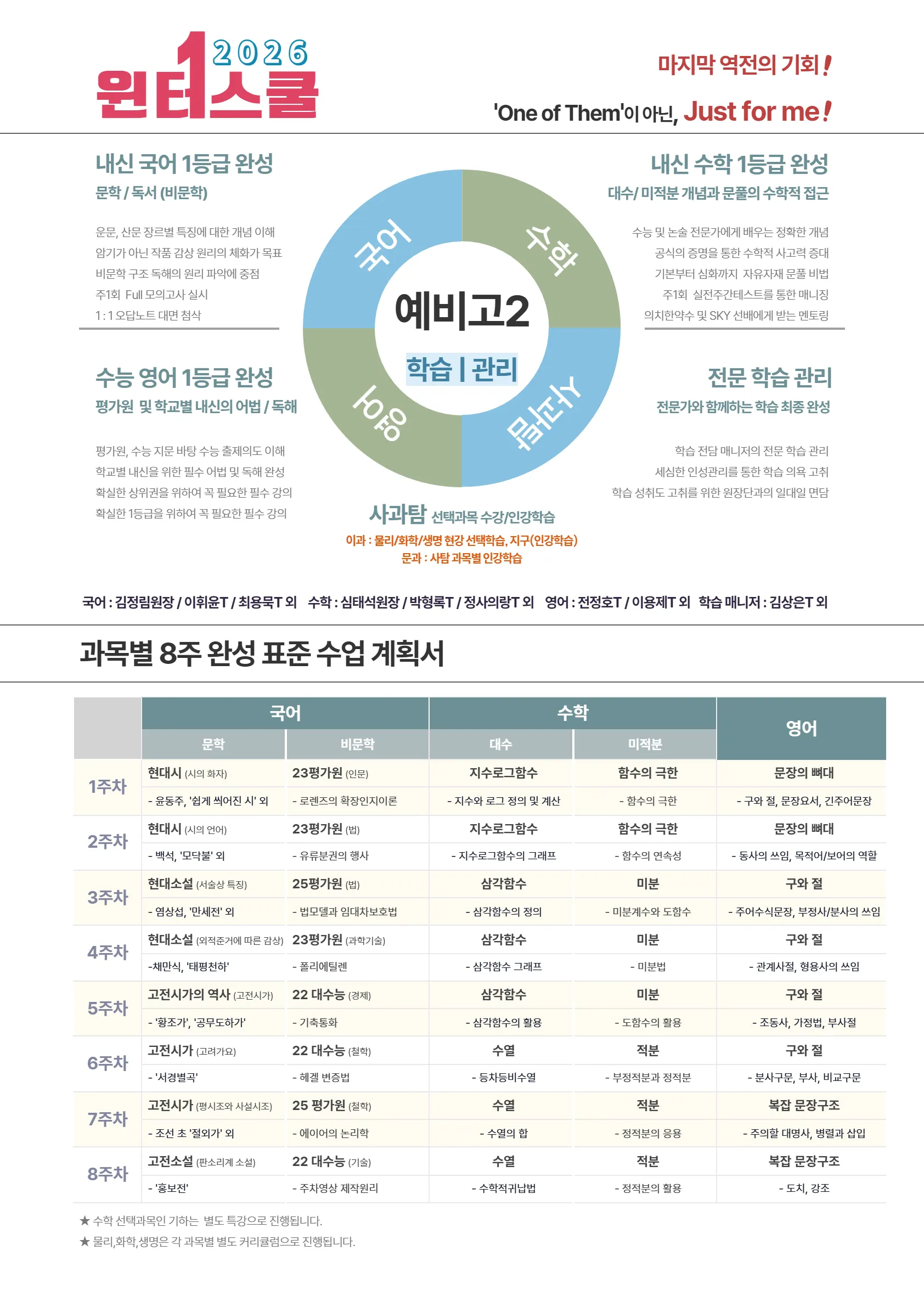 국/영/수/통과/화학/생명 등 전과목을 마스터할 수 있는 시스템입니다. 하루 13시간(9-22시), 주 6+1일 썸머4주/윈터8주 국수코스/시대코스로 학습을 완성시킵니다.