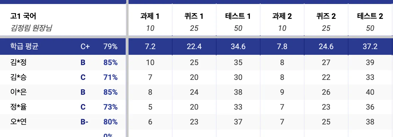 김*정 학생은 쉬운 난이도의 과제와 퀴즈에서는 만점을 받았지만, 사고력과 이해력이 필요한 수능형 문제로 이뤄진 테스트에서는 상대적으로 점수가 나오지 않았다. 기본기가 없지 않는 학생이지만, 수능형에서 요구되는 분석력이 부족하다. 때문에 분석력을 키울 수 있는 국어 지문 분석 수업 및 과제 등이 더 요구된다.